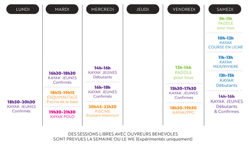 Des sessions Adultes de kayak et paddle « libres » avec des ouvreurs sont proposées tout au long de l’année suivant la disponibilités des bénévoles.